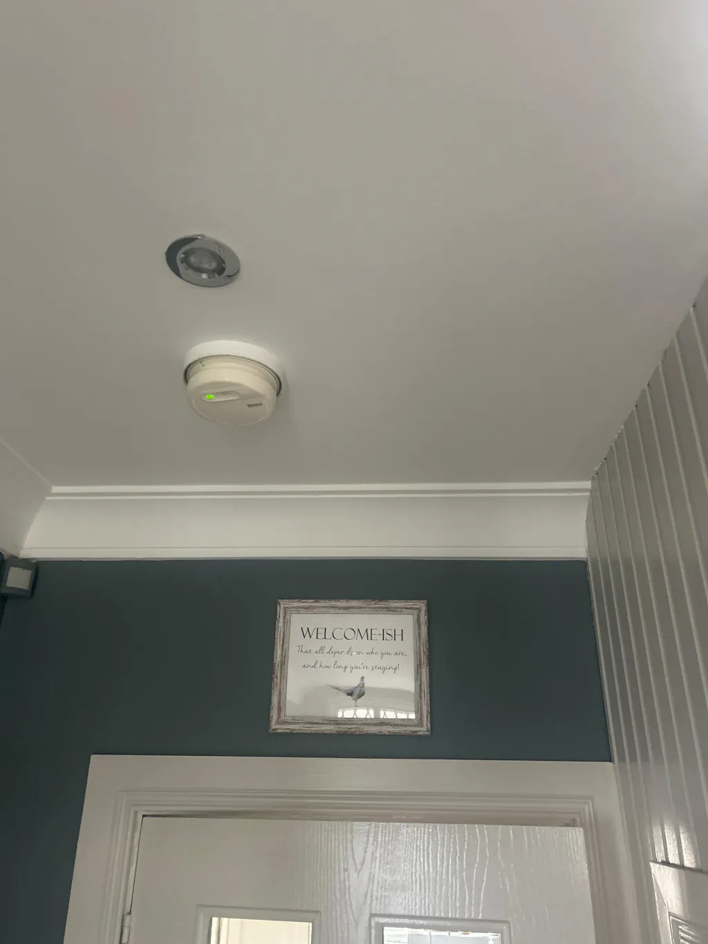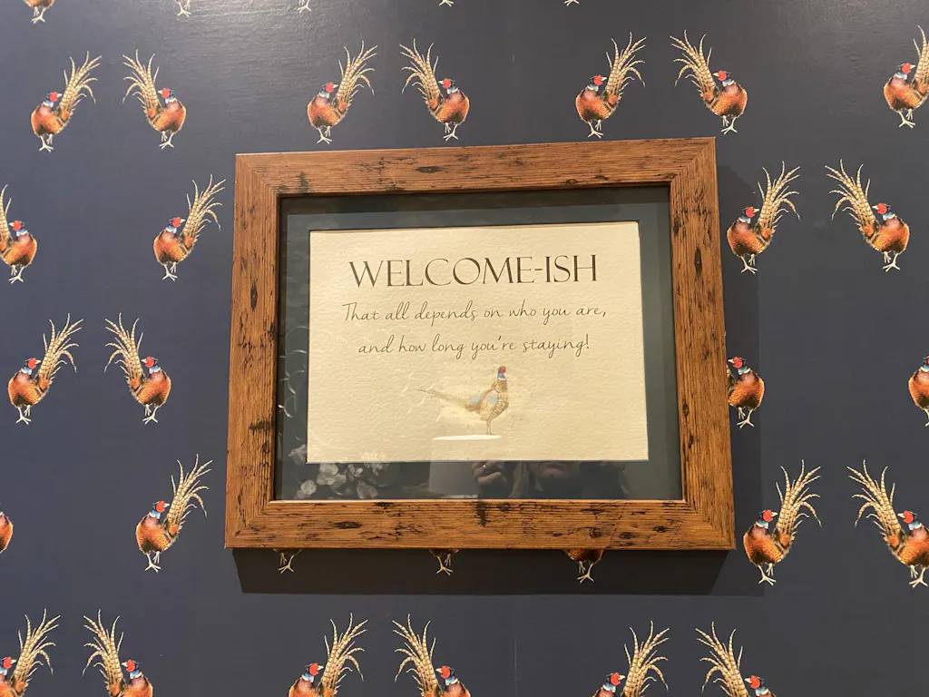 It says 'Welcome-ish. That all depends on who you are, and how long you're staying''. With a watercolour illustration of either three brown hens or a pheasant.